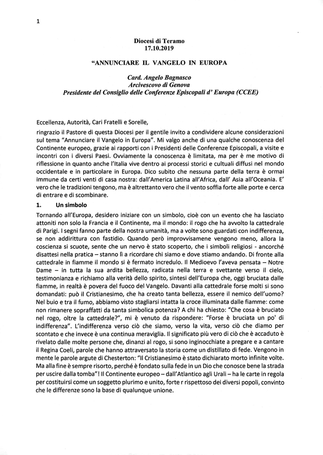 Sintesi video e testo dell’intervento del Cardinale Angelo Bagnasco nel Duomo di Teramo per l’inaugurazione dell’anno accademico 2020 del Centro per la Teologia “San Paolo VI” e il Mandato Missionario degli Operatori Pastorali