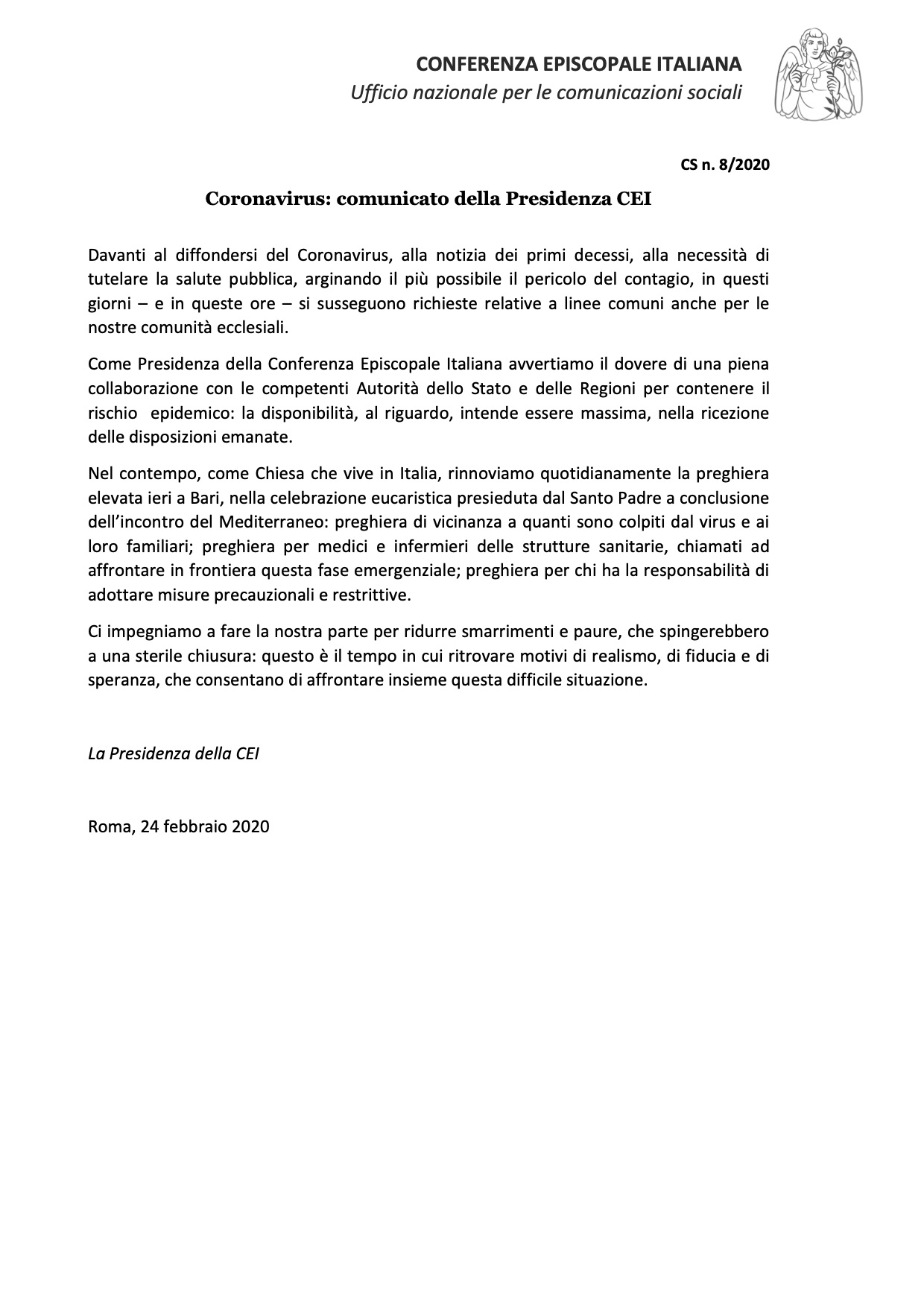 Coronavirus: comunicato della Presidenza CEI
