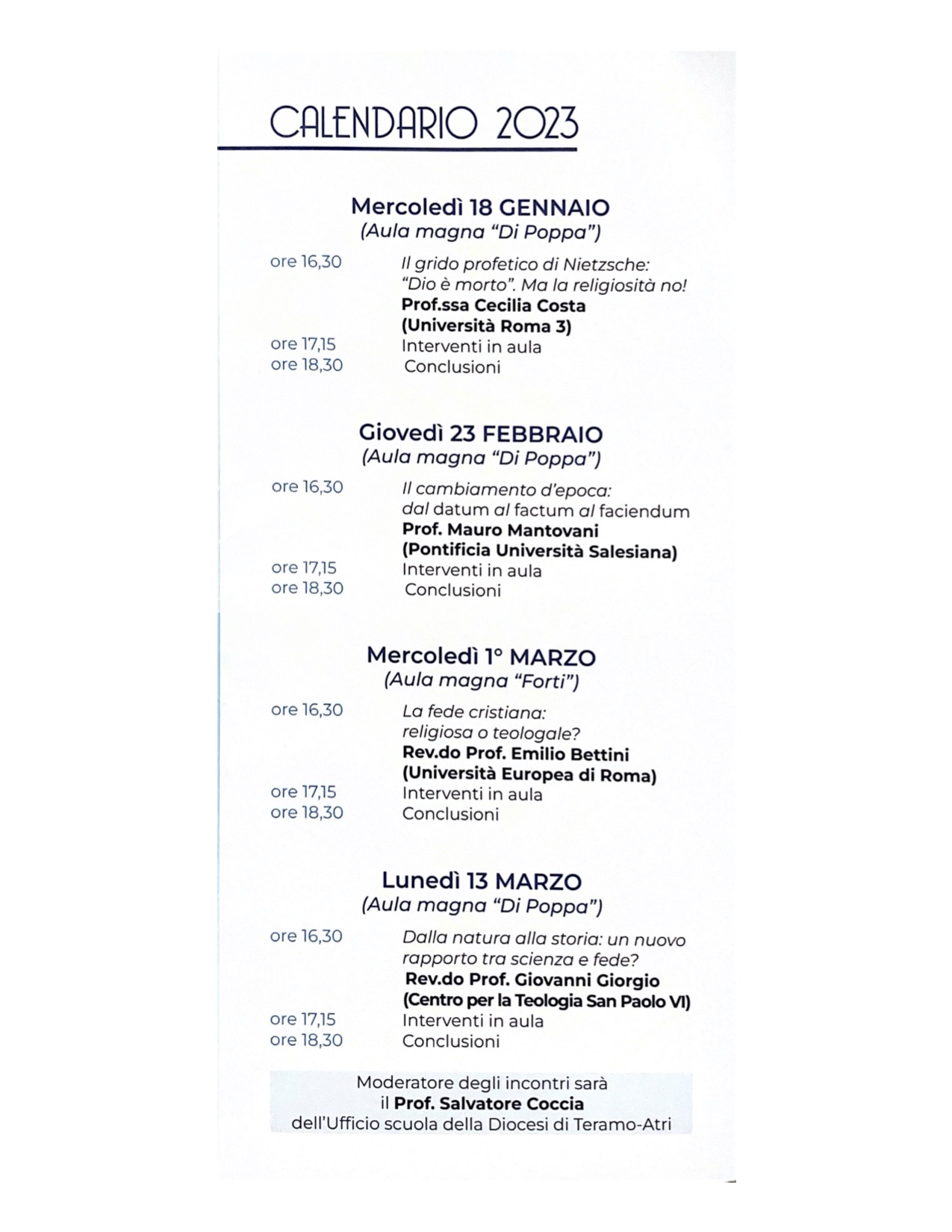 Al fine di favorire la loro formazione permanente, in un dialogo fruttuoso tra teologia e cultura contemporanea, di concerto con il Centro per la Teologia «S. Paolo Vi», l’Ufficio scuola della Diocesi di Teramo-Atri ha organizzato un ciclo di incontri rivolti specificamente agli insegnanti di Religione cattolica, per un proficuo discernimento dei segni dei tempi che viviamo e l’adozione di scelte educative mature che non si limitino alla burocratica attuazione dei programmi ministeriali.