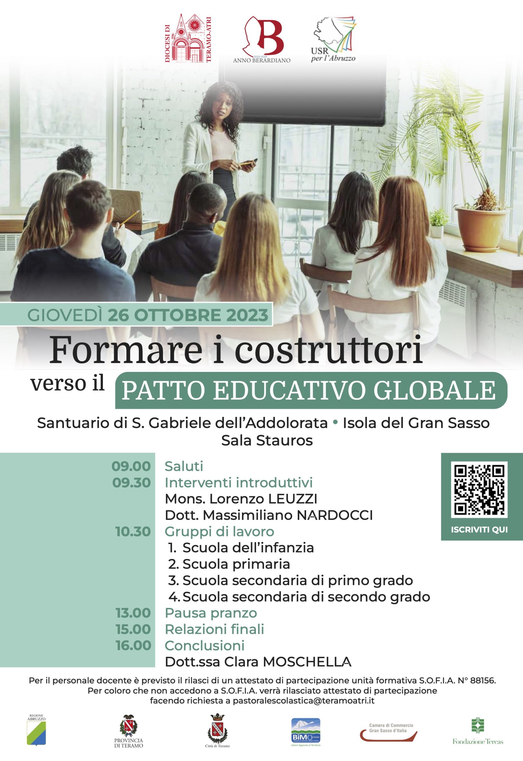 La prossima in programma è il convegno dal titolo “Formare i costruttori verso il Patto Educativo Globale”, organizzato dalla Pastorale scolastica diocesana insieme all’Ufficio Scolastico Regionale per l’Abruzzo, che si terrà giovedì 26 ottobre 2023 alle ore 9.00 presso il Santuario di S. Gabriele dell’Addolorata ad Isola del Gran Sasso.