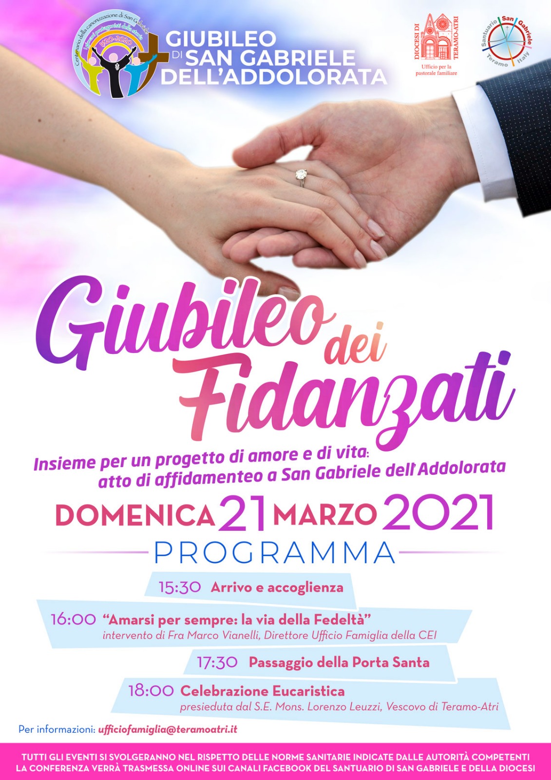 Domenica 21 marzo, a partire dalle 15.30, nell’ambito delle celebrazioni per il Centenario della Canonizzazione di San Gabriele, si festeggerà il Giubileo dei Fidanzati, da seguire via web tramite le pagine Facebook “Santuario di S. Gabriele dell’Addolorata” e “Chiesa di Teramo-Atri” o in presenza per chi provenga da comuni fino a 5.000 abitanti e distanti non più di 30 chilometri dal Santuario.