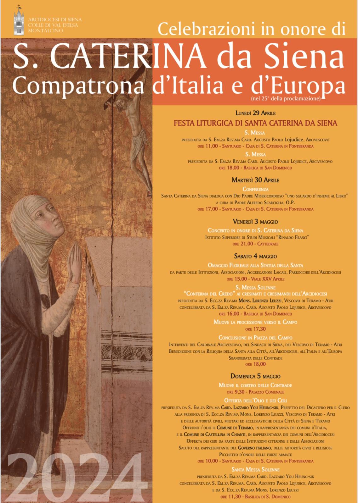 Alle ore 11,30, nella Basilica di San Domenico a Siena si terrà la Santa Messa Solenne presieduta dal Card. Lazzaro You Heung-Sik, Prefetto del Dicastero per il Clero e concelebrata dal Card. Augusto Paolo Lojudice, e da Mons. Lorenzo Leuzzi.