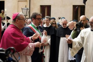 Lunedì 29 aprile, giorno della festa liturgica di Santa Caterina da Siena, durante la Santa Messa delle ore 19:30 nel Duomo di Teramo, Sua Eccellenza Monsignor Lorenzo Leuzzi ha benedetto l’olio che è stato offerto dalla città di Teramo, per le mani del sindaco Gianguido D’Alberto, a Santa Caterina nel giorno di domenica 5 maggio a Siena, nell’ambito delle celebrazioni cittadine per la compatrona d’Italia e d’Europa.