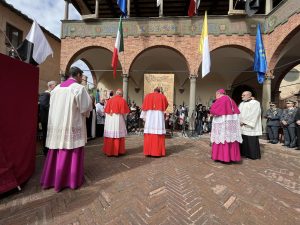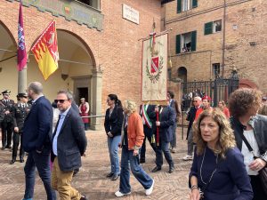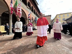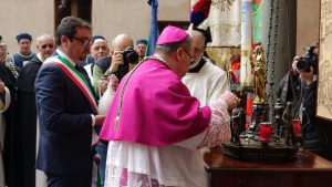 Il giorno successivo, sabato 4 maggio, insieme alla delegazione diocesana il vescovo Lorenzo ha presieduto la Santa Messa Solenne con la “Conferma del Credo” ai cresimati e ai cresimandi. Rito concelebrato dall’Arcivescovo di Siena-Colle Val D’Elsa-Montalcino, il Cardinale Augusto Paolo Lojudice. As seguire si è mosso il corteo dalla basilica di San Domenico verso il Campo dove si sono tenuti gli interventi del Cardinale Lojudice, del Sindaco di Siena, Nicoletta Fabio, e di Mons. Lorenzo Leuzzi. Subito dopo è stata impartita la benedizione con la reliquia della Santa alla città, all’Arcidiocesi, all’Italia e all’Europa. Al termine la sbandierata delle contrade.