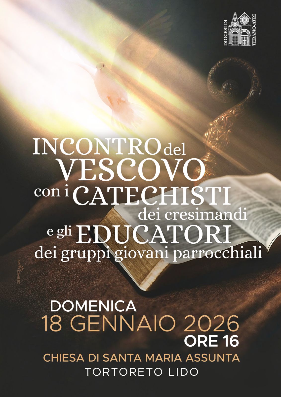 Domenica 18 gennaio alle ore 16.00 presso la Chiesa di Santa Maria Assunta di Tortoreto Lido il Vescovo Lorenzo incontra i catechisti dei cresimandi e gli educatori dei gruppi giovani parrocchiali che nelle loro realtà in diversi modi e tempi accompagnano bambini e ragazzi prestando servizio educativo.