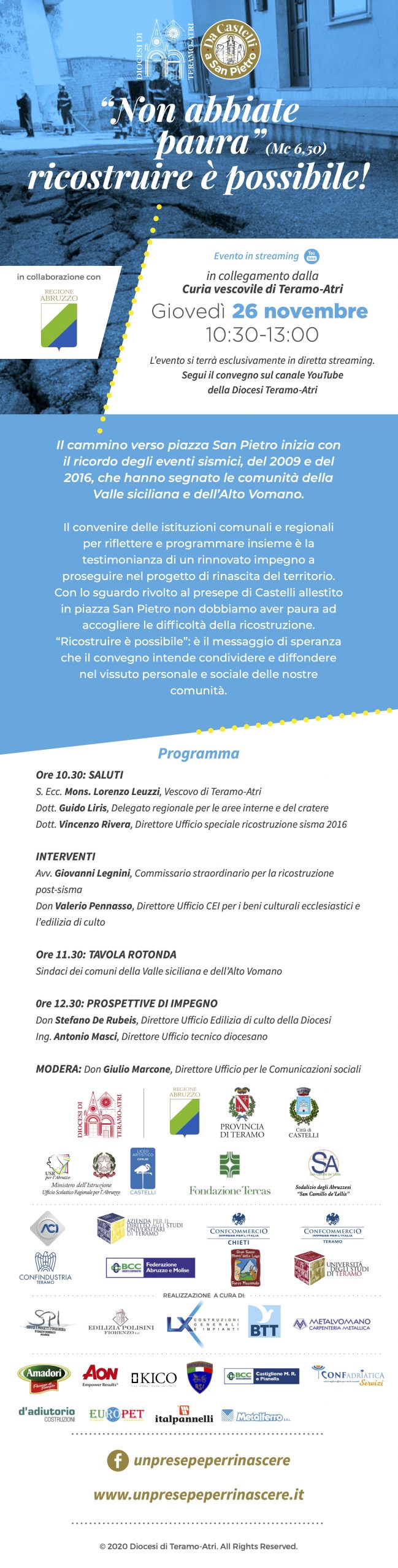Il convenire delle istituzioni comunali e regionali per riflettere e programmare insieme è la testimonianza di un rinnovato impegno a proseguire nel progetto di rinascita del territorio. Con lo sguardo rivolto al presepe di Castelli allestito in piazza San Pietro non dobbiamo aver paura ad accogliere le difficoltà della ricostruzione. “Ricostruire è possibile”: è il messaggio di speranza che il convegno intende condividere e diffondere nel vissuto personale e sociale delle nostre comunità.